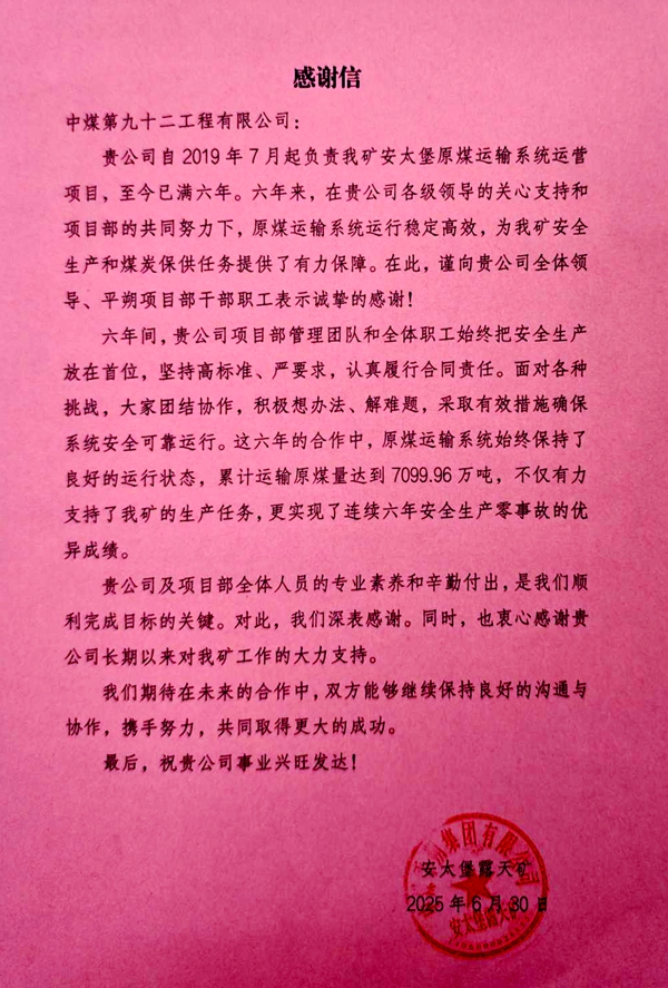 近日,平朔项目部收到安太堡露天矿感谢信,对项目部全体职工的专业素养、辛勤付出及对安太堡露天矿的大力支持表示衷心感谢。