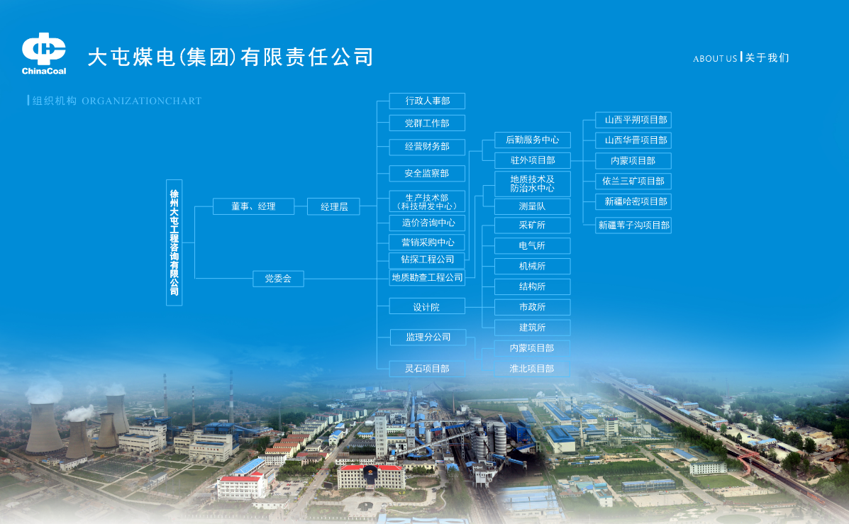 徐州大屯工程咨询有限公司(以下简称“工程咨询公司”)是BB电子·(中国)游戏官网 能源集团有限责任公司(以下简称“BB电子·(中国)游戏官网 ”)大屯煤电(集团)有限责任公司(以下简称“大屯公司”)的全资子公司,成立于2005年6月,注册资金5000万元。主营业务包括煤矿防治水、煤矿瓦斯抽采治理、煤矿防治冲击地压治理、煤矿煤层注水、煤矿顶板水力致裂等地质工程钻探业务,煤矿采掘工作面综合物探业务,煤矿注浆治理等地质灾害治理业务,煤矿地质构造探查、煤矿地面启封孔等地质工程探查业务,煤炭行业、建筑、市政道路等工程设计,工程监理,造价咨询,项目全过程咨询业务。工程咨询公司是BB电子·(中国)游戏官网 唯一一家拥有地质矿产勘查和地质钻探甲级资质单位,是国家科技部认定的“高新技术企业”,是中国矿业大学“产学研”基地,也是大屯公司集地质工程勘查、地质灾害治理、工程设计、工程监理、造价咨询以及项目全过程咨询业务于一身的综合性技术服务型企业。工程咨询公司在册员工190人,大专及以上学历人员占总人数的79%以上;下设行政人事部、党群工作部、经营财务部、安全监察部、生产技术部(科技研发中心)5个机关科室,钻探工程公司、地质勘查工程公司、设计院、监理分公司、造价咨询中心、营销采购中心6个基层单位。