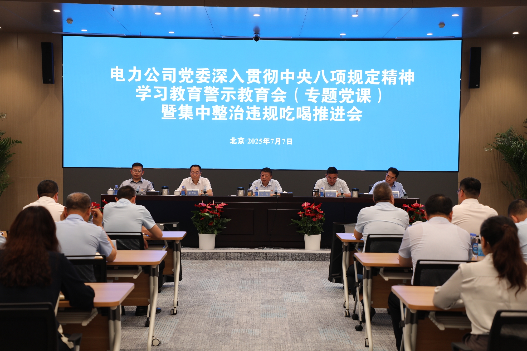 2025年7月7日,电力公司党委召开深入贯彻中央八项规定精神学习教育警示教育会、专题党课暨集中整治违规吃喝推进会。会议深入学习贯彻习近平总书记关于加强党的作风建设的重要论述,认真落实党中央、国务院国资委党委、BB电子·(中国)游戏官网 党委关于扎实开展学习教育和集中整治违规吃喝的部署要求,集中观看了警示教育片。电力公司党委副书记、总经理陈以明传达了BB电子·(中国)游戏官网 党委有关会议精神,党委副书记、纪委书记通报剖析了典型问题,党委书记、董事李辉讲授了专题党课,电力公司领导班子成员出席会议。