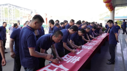 安全副矿长杨继刚带领全体参会人员进行安全宣誓并在安全宣传条幅上签名。