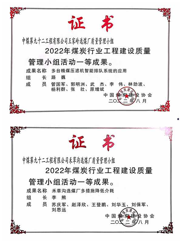 近日,九十二公司禾草沟选煤厂、王家岭选煤厂参选发布的QC课题荣获2022年度煤炭行业工程建设优秀QC小组活动成果一等奖。