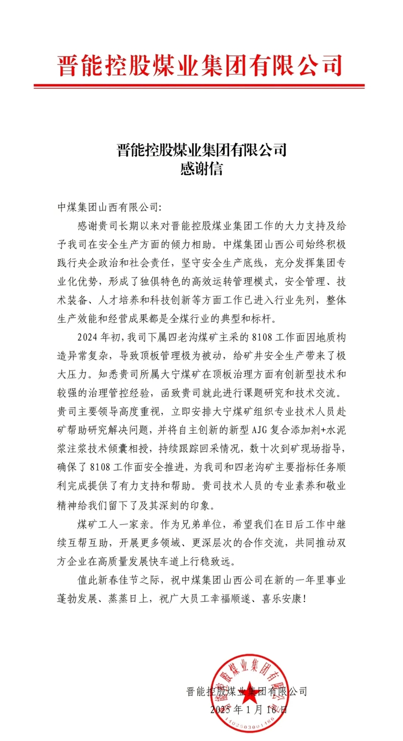 近日,山西公司收到晋能控股煤业集团公司的感谢信,对大宁公司为其提供的技术援助表示感谢。