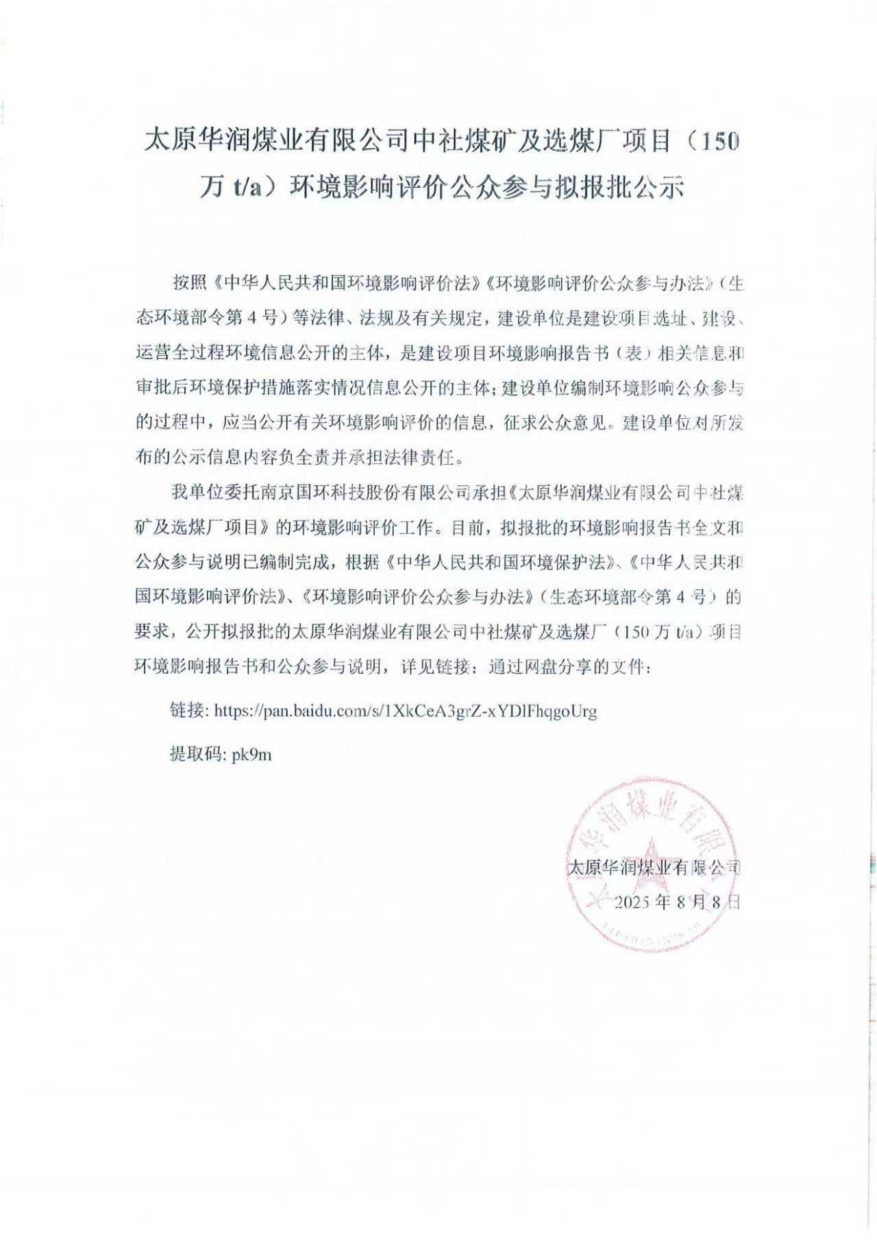 太原华润煤业有限公司中社煤矿及选煤厂项目(150万t/a)环境影响评价公众参与拟报批公示