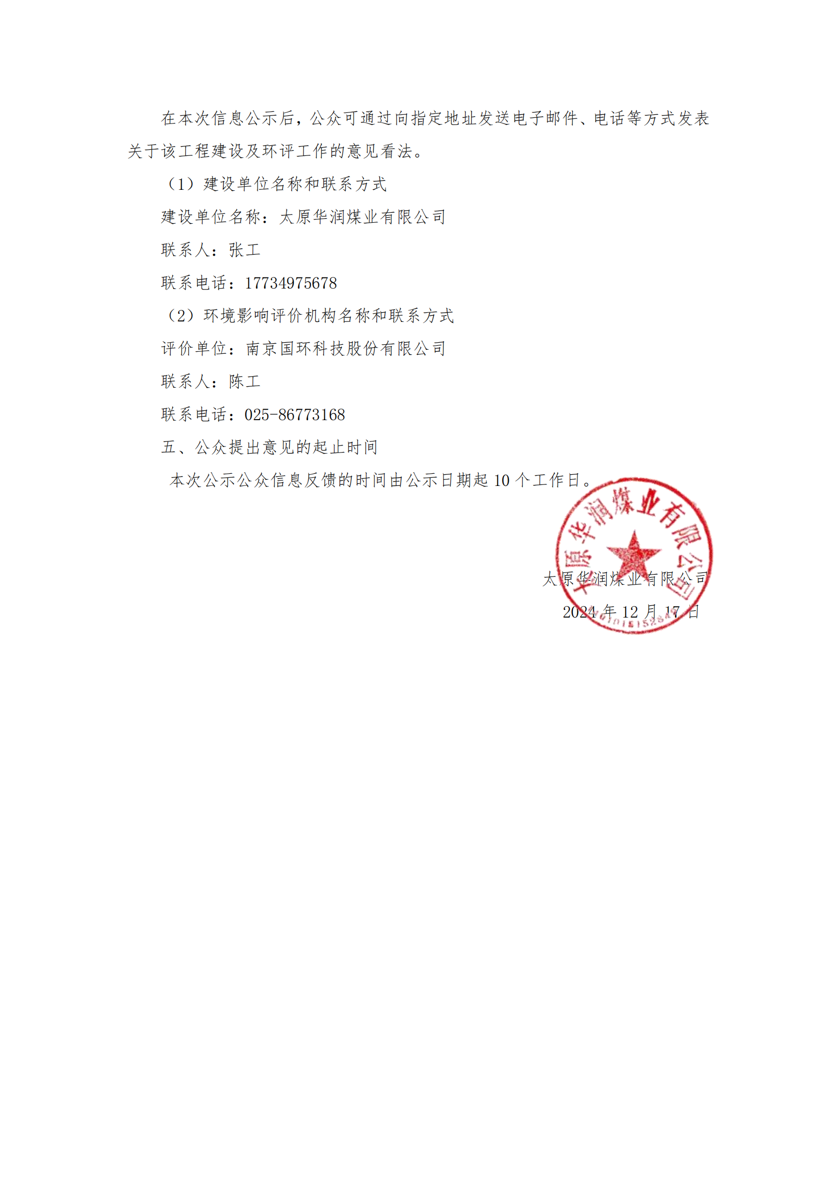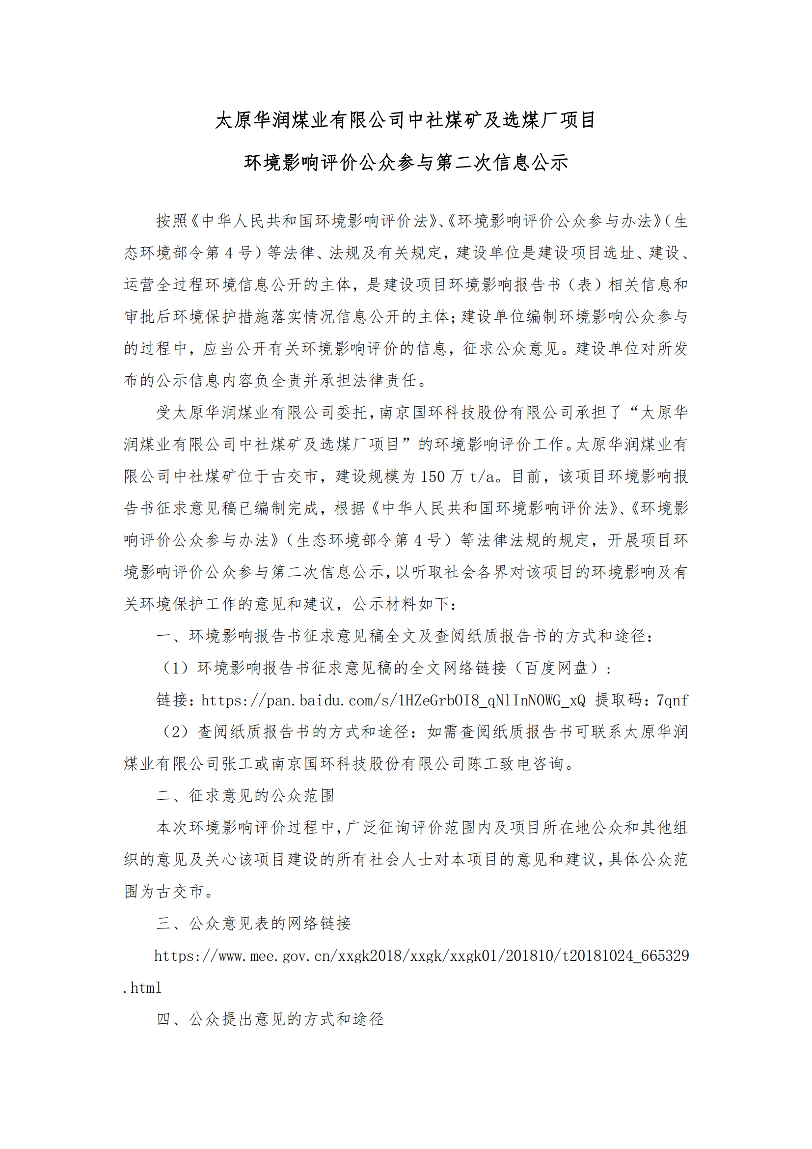 太原华润煤业有限公司中社煤矿及选煤厂项目环境影响评价公众参与第二次信息公示