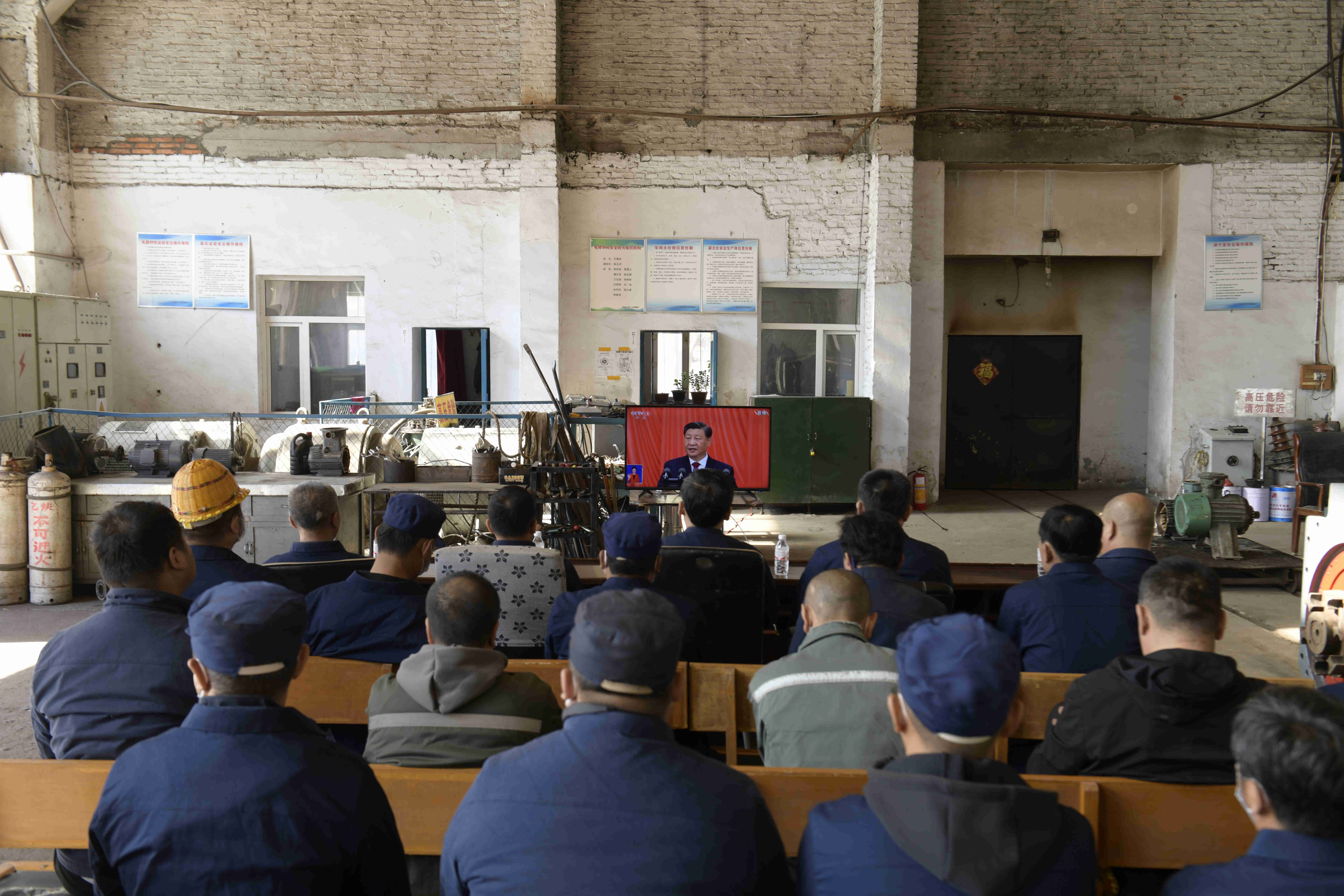公司党委书记、执行董事魏伟在依兰三矿机电运输区维修班与班组党员干部、职工群众一起观看中国共产党第二十次全国代表大会开幕会。