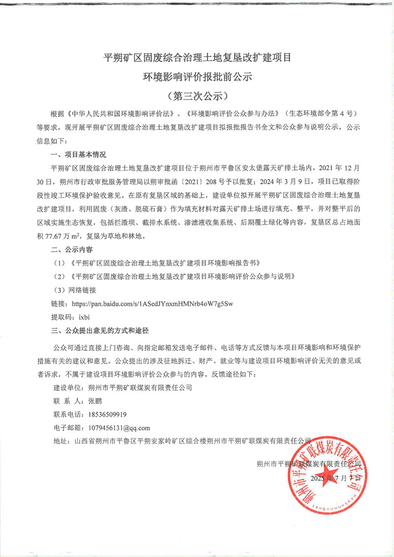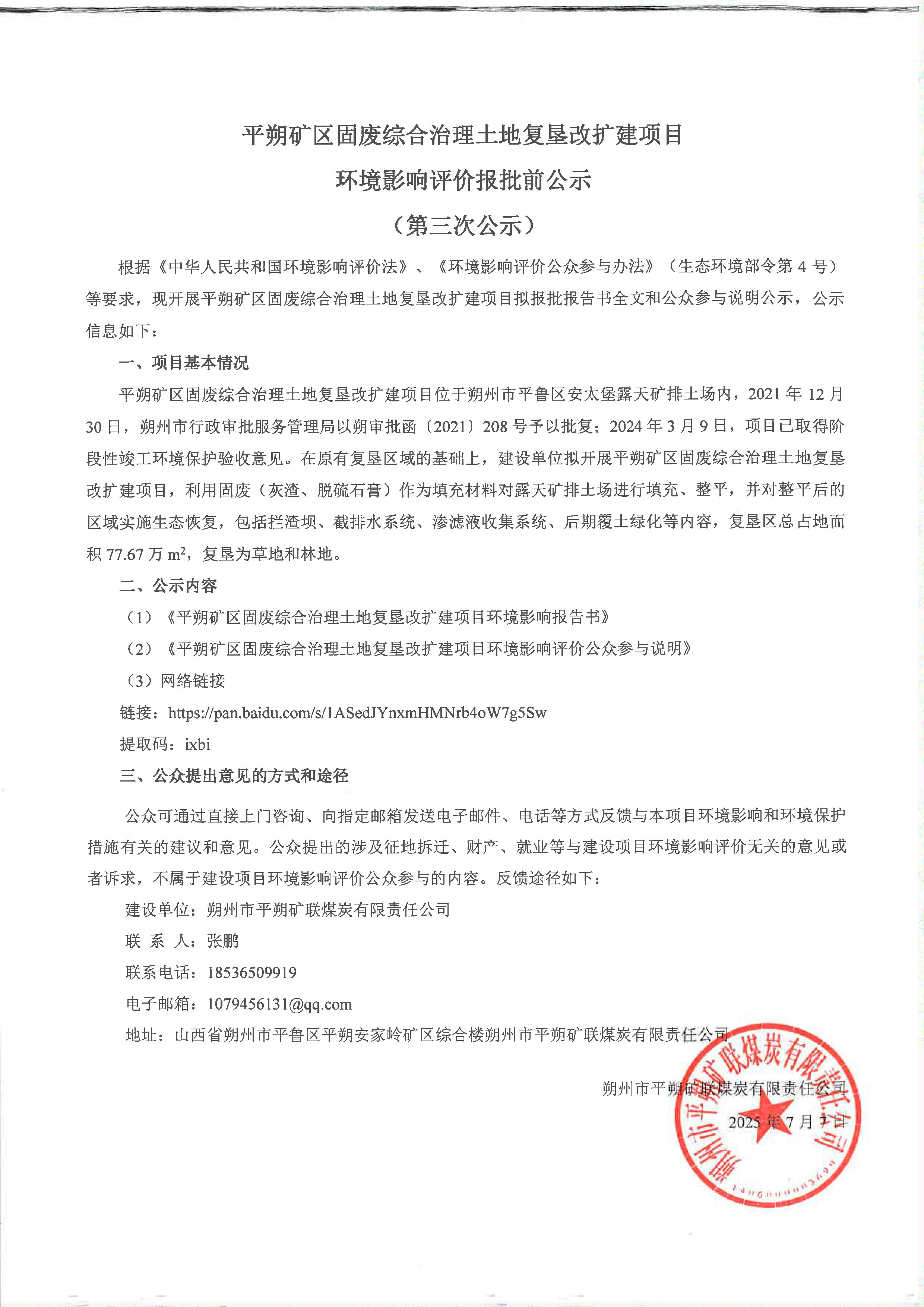 平朔矿区固废综合治理土地复垦改扩建项目环境影响评价报批前公示(第三次公示)