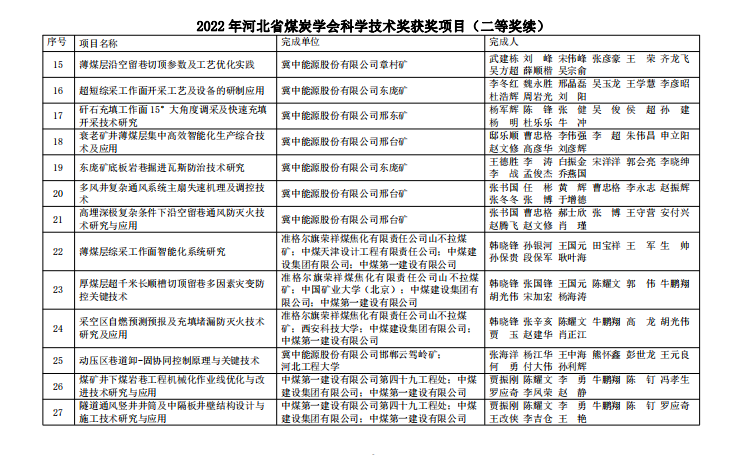 该3项技术成果分别为《厚煤层超千米长顺槽切顶留巷多因素灾变防控关键技术》填补了中煤集团3.0m~4.0m厚煤层以及2000m以上走向长工作面条件下的留巷试验及推广技术空白,并在国内外厚煤层超长顺槽工作面沿空留巷方面实现了首次突破;《采空区自燃预测预报及充填堵漏防灭火技术研究及应用》首次根据绝热氧化实验,提出了计算煤不同条件下煤升温规律和煤实验最短自燃发火期和自燃极限参数的新方法,并根据自燃指标气体的历史曲线判断煤温度的专家系统,提高了可靠性和准确性,实现了煤自燃预报的智能化,已在内蒙古、河北省、陕西省等10余个煤炭企业推广应用,有效地预防了煤层自燃火灾,取得明显的社会经济效益;《薄煤层综采工作面智能化系统研究及应用》实现了煤机记忆截割、支架自动跟机动作,系统整体协同保护,大大降低工作面安全风险隐患,减少井下作业人员数量。