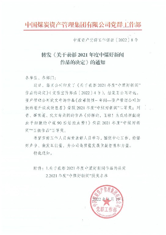 中煤资产党群工作部函〔2022〕8号附件1 关于表彰2021年度中煤好新闻作品的决定.pdf: