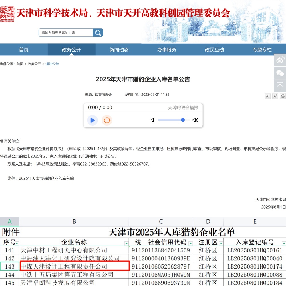 近日,天津市科学技术局发布《2025年天津市猎豹企业入库名单公告》,中煤天津设计公司荣获天津市首批“猎豹企业”称号,成为天津市重点培育的高成长性科技企业之一。