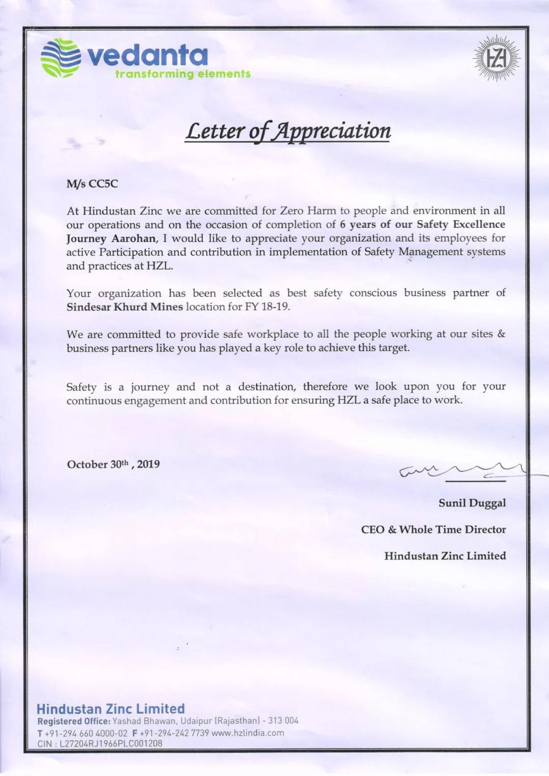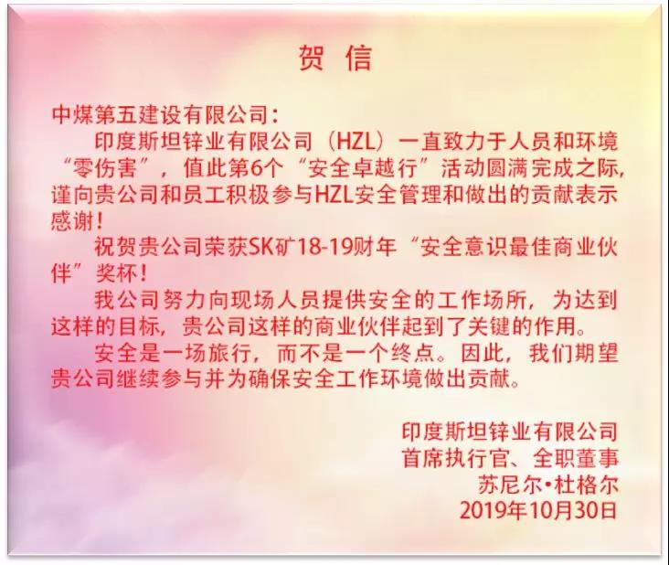 会上,公司凭借在HZL旗下SK矿区施工连续6年安全生产无事故的出色业绩,被评为SK矿2018-2019财年“安全意识最佳商业伙伴”。HZL公司首席执行官、全职董事苏尼尔•杜格尔亲自为公司颁发奖杯和贺信,并对公司积极参与HZL安全管理和做出的贡献表示感谢,期望公司继续参与项目建设并为确保安全工作环境做出更大贡献。