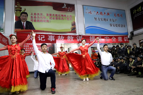 “警示三月行”,歌声舞蹈传佳音。慰问演出以舞蹈《亲亲茉莉花》拉开序幕。由公司文工团自编自演的节目,通过动静结合的舞蹈、风格迥异的歌曲、幽默风趣的魔术等多种丰富的节目形式为煤矿工人们送去安全祝福。台上乐声悠扬,舞姿优美,台下气氛融洽,掌声不断,一片欢声笑语。