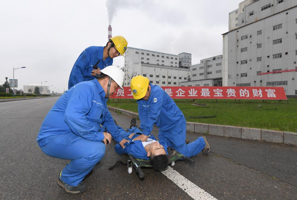此次演练模拟气化装置区2名现场操作工在现场巡检时,发生煤气泄漏,造成一名操作工中毒,同时引发火灾。另一名操作工向班长汇报,班长向生产调度和装置负责人汇报后,马上组织现场救治。调度经现场确认,迅速向园区医疗救护站和园区消防队报警,应急指挥中心对现场危害程度做出判断后,向公司应急总指挥汇报了现场情况,接到指命后迅速展开应急救援。整个演练各项环节紧扣,应急处理得当,符合应急响应流程。经过1小时零5分紧张有序救援,中毒人员得到及时救治,火灾扑灭。