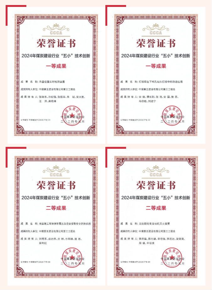 近日,中国煤炭建设协会公布了2024年煤炭建设行业“五小”技术创新成果评审结果,三处4项成果获奖。其中,三山岛项目部《吊盘位置实时检测装置》、特凿分公司《打捞筒在下料孔钻头打捞中的改进应用》2项成果获评一等成果,机电设备管理中心《地面施工车辆倒车雷达及语音报警安全防撞系统》、张庄项目部《无轨胶轮车发动机灭火装置》2项成果获评二等成果。