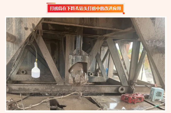 将打捞筒的结构形式应用到大钻头的打捞中,利用打捞筒底部楔形结构引鞋的引导功能,在钻具旋转的过程中,可以将掉落的物品扶起,并引导其进入打捞筒内,在原打捞筒的基础上增加了打捞钩子,既可有效将钻头托住,又可增加引导作用,然后通过镶嵌的钢丝绳将其卡死,最终将掉落的钻头打捞出钻孔。