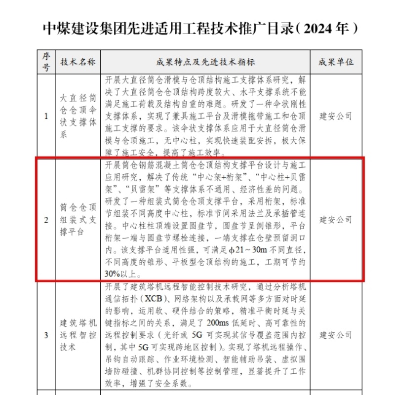 为加大关键技术成果的推广力度,促进科技成果转化为现实生产力,近日,中煤建设集团正式发布了《2024年度先进适用工程技术推广目录》,公司申报的“筒仓仓顶组装式支撑平台”技术成果成功入选。