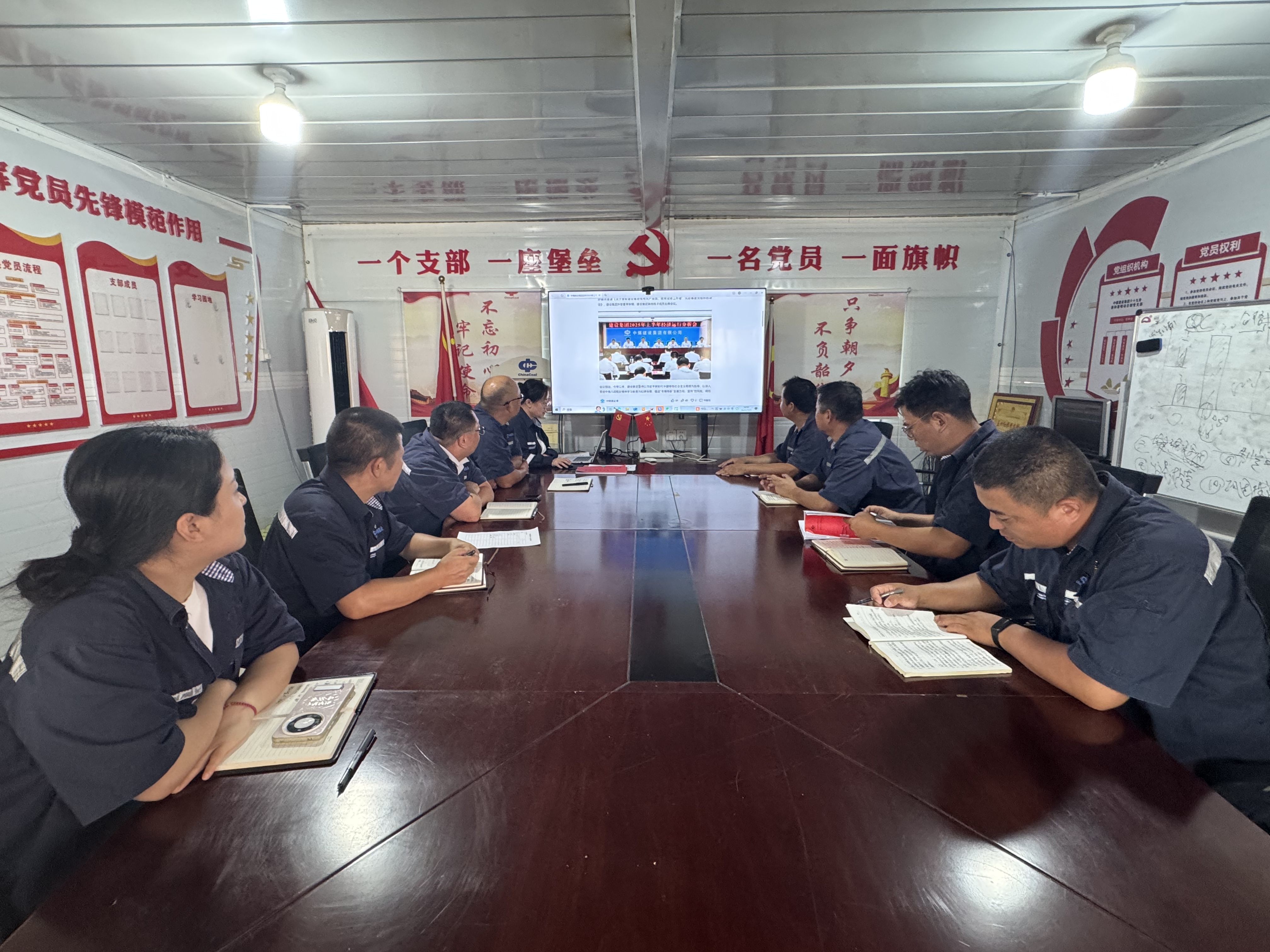 活动中,支部组织全体参会人员集中学习了《习近平关于加强党的作风建设论述摘编》相关内容,学习了两级集团2025年上半年经济运行分析会精神,结合集团会议精神与项目实际,项目负责人向与会人员做了形势任务教育,分析了当前项目在生产经营、安全管控等方面存在的问题,并提出了下一步改进的措施。随后,与会人员围绕技术创新、智能应用等方面进行了讨论,确定了下一步要攻关的技术课题。会议号召全体干部要将学习成果转化为推动工作的强大动力,将集团“控风险、调结构、提质量、稳增长”的工作要求落实到项目建设的各个环节,积极投身于技术攻关和智能化升级。