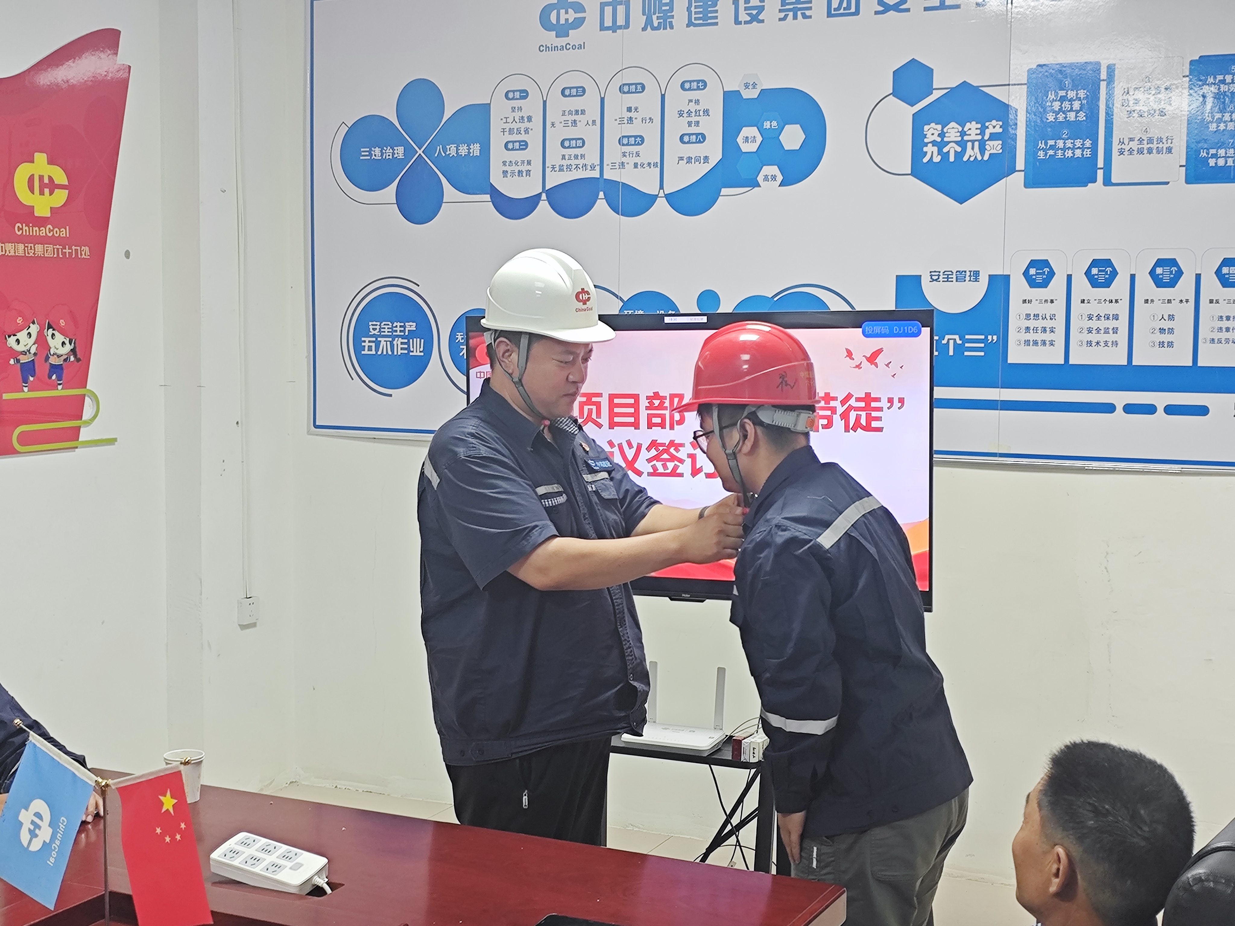 在庄重温馨的拜师环节,师徒双方共同签订了《导师带徒协议书》。徒弟恭敬地向师傅奉上拜师茶,表达对师傅的尊重与感激;师傅郑重接过茶盏,接受这份沉甸甸的信任。随后,师傅为徒弟佩戴安全帽、系好帽带,不仅体现了对安全规范的高度重视,更象征着工匠精神的代代相传。师傅结合自身经验向徒弟提出殷切期望,徒弟也诚恳表态,将虚心学习、勤勉履职,绝不辜负师傅与项目的培养。