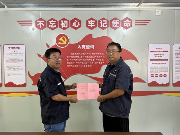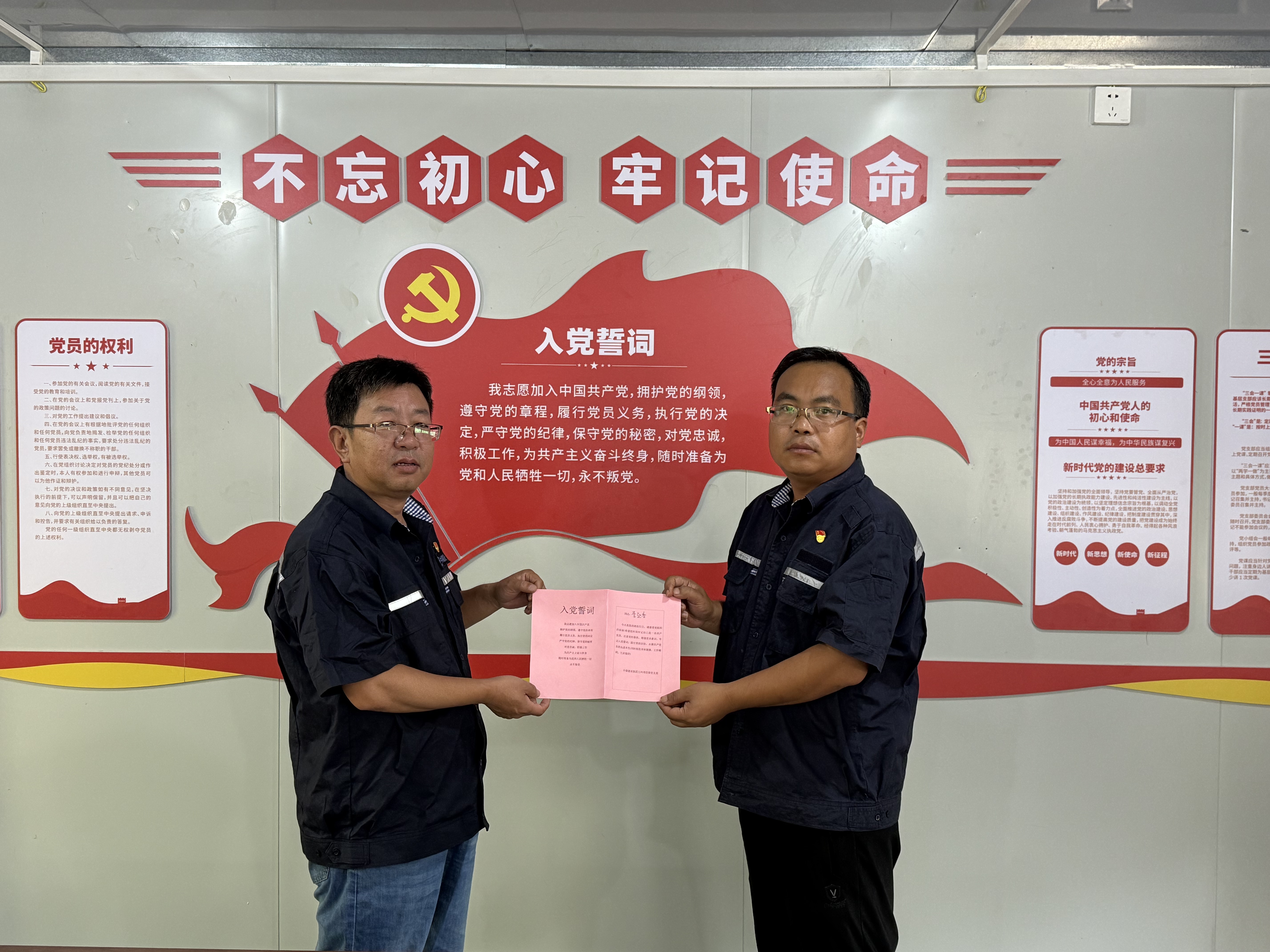 随后,党支部精心准备了政治生日贺卡,贺卡上印有入党誓词以及对两位党员的生日寄语,承载着党组织对党员的深深关怀与殷切期望。在项目全体党员的见证下,姜波和李赵春重温了入党誓词,回顾了自己的入党历程与初心使命。