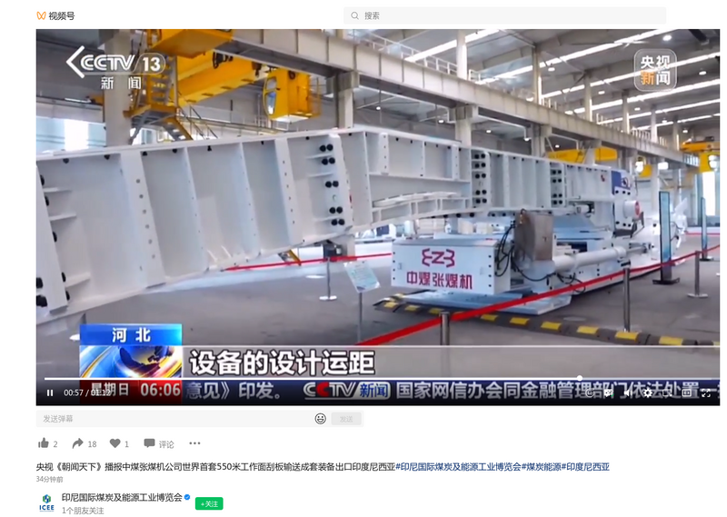 印尼国际煤炭及能源工业博览会微信视频号报道——央视《朝闻天下》播报中煤张煤机公司世界首套550米工作面刮板输送成套装备出口印度尼西亚