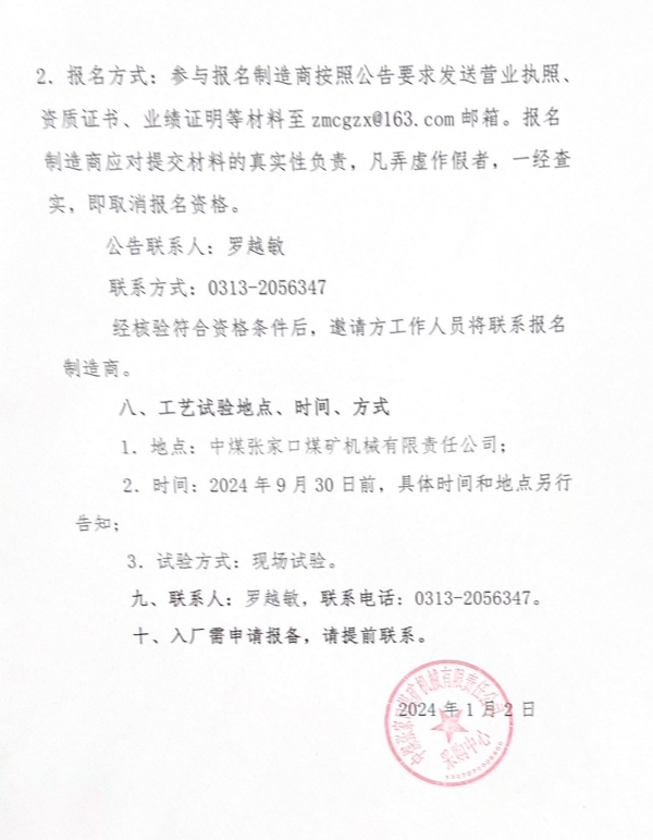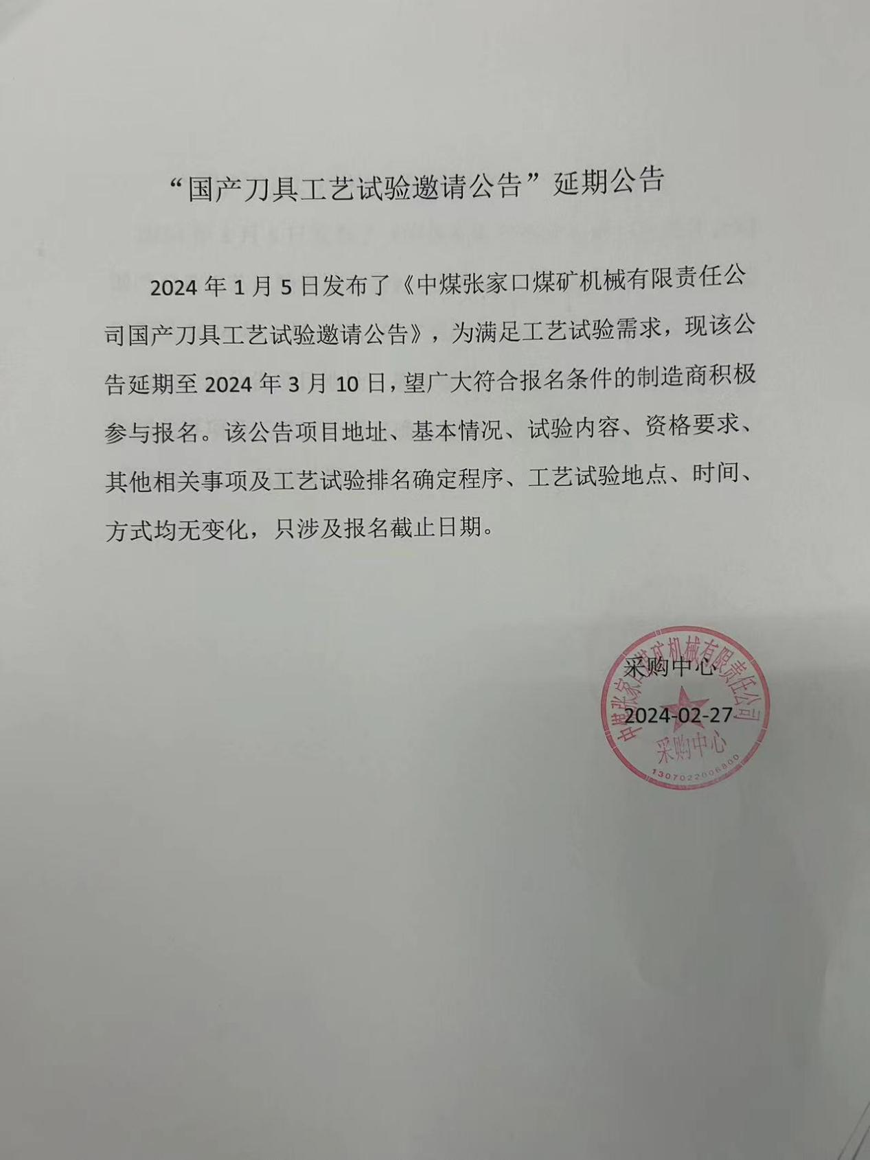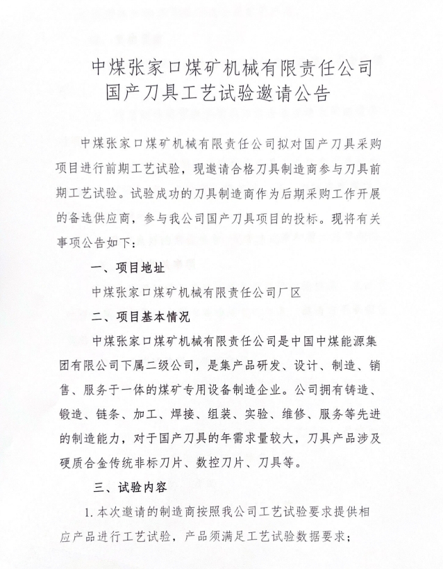 BB电子·(中国)游戏官网 张家口煤矿机械有限责任公司“国产刀具工艺试验邀请公告”延期公告