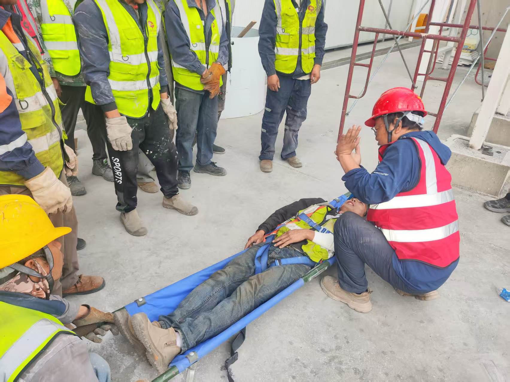 大南湖项目部模拟施工现场突发高空坠落事故,现场人员第一时间上报险情,应急救援小组快速集结,严格遵循应急流程,科学评估“坠落伤员”伤情,规范使用担架转移伤员,各环节衔接紧密、处置规范,高效完成救援模拟任务。
