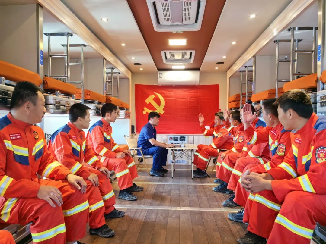 现场情况比预想更为复杂。一片汪洋,水下杂物遍布,抢险时间紧迫。中煤榆林队布置好排涝阵地后,立即召开临时党支部成立后的第一次会议。狭小的车厢里,13名指战员围坐在一起,党旗庄严地贴在车门内侧,映照着每一张坚毅的面孔。