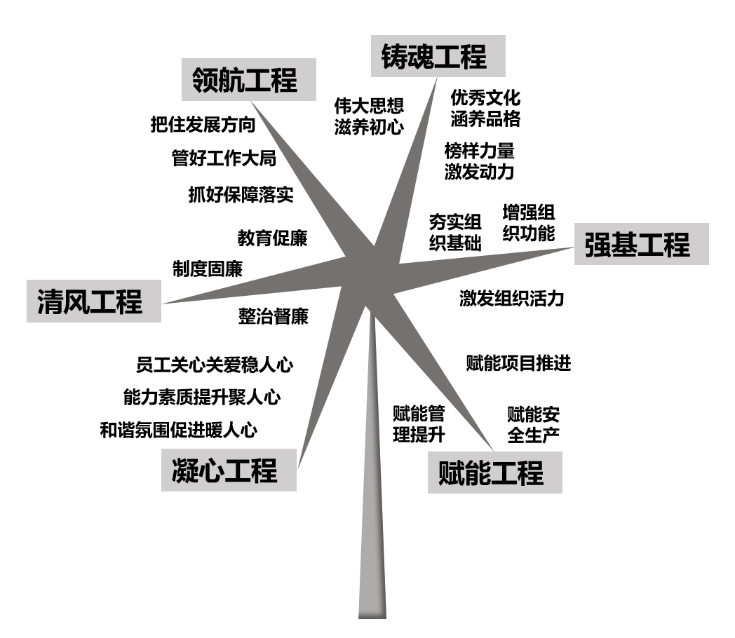 “旗帜红‧生态绿”党建品牌以习近平总书记关于党的建设的重要思想为根本遵循,以“领航、铸魂、强基、赋能、凝心、清风”六项党建工程为关键抓手,从政治、思想、组织、纪律、作风、文化等纬度把国企党建的各个重点环节有机贯通起来,推动党建和企业改革发展同频共振、互促共赢。
