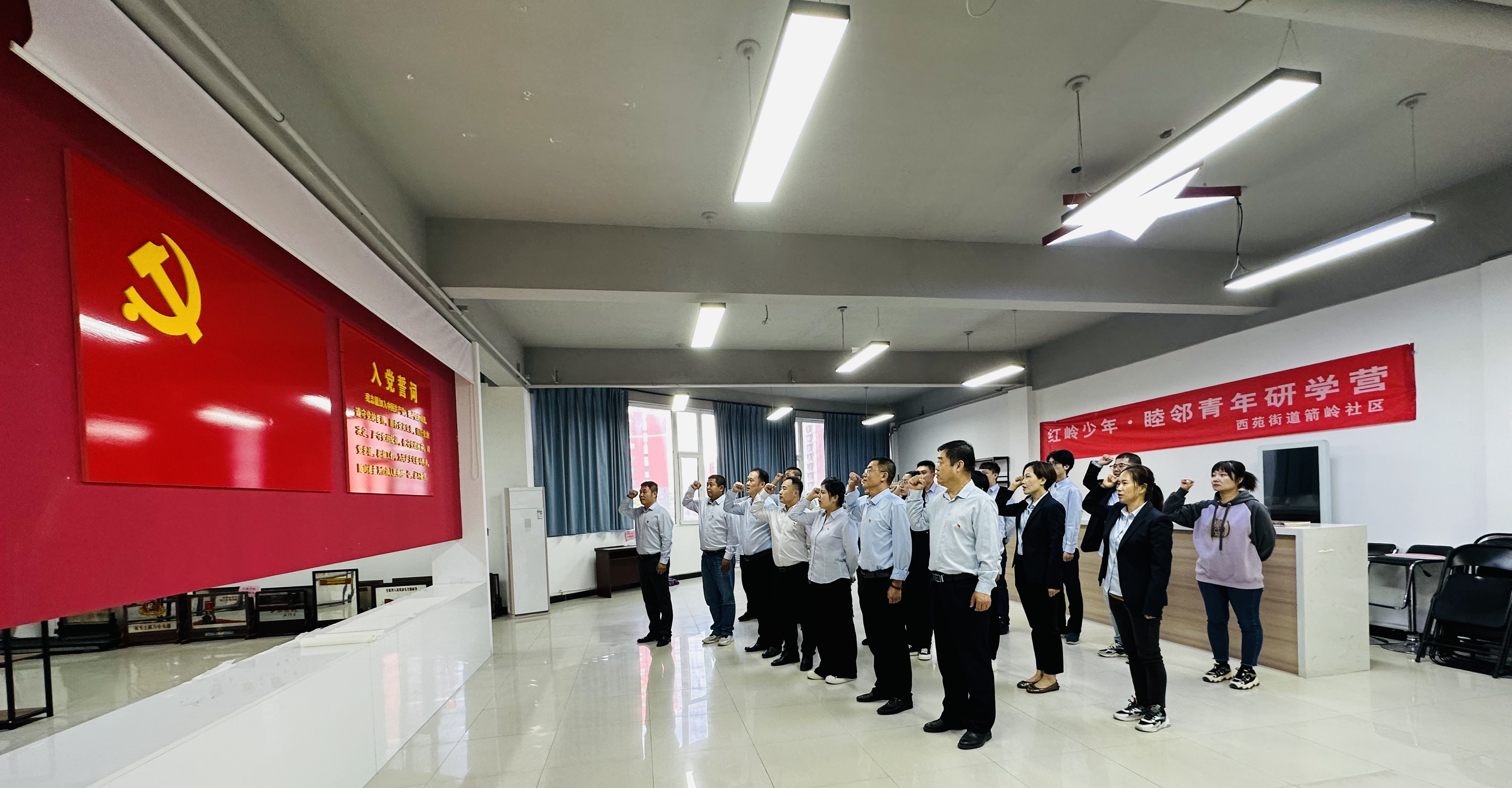 怀揣对革命先烈的无限敬仰,大家参观了走廊中革命先辈的英雄事迹,简单的描述便刻画出他们无私奉献、敢于牺牲的光辉形象,让人不由得肃然起敬,来到展厅,映入眼帘的是开国大典的巨幅油画,跟随工作人员的脚步,听他讲解革命领袖的奋斗历程,一幅幅书写着红色精神的字画,一张张珍贵的历史照片,一件件老物件,也在无声地讲述着那个年代的故事,点燃了在场每个人的爱国热情。“我志愿加入中国共产党,拥护党的纲领,遵守党的章程……”一声声坚定有力的宣誓声,不仅仅是对入党誓词的重温,更是作为一名党员敢于自我鞭策的庄严承诺。